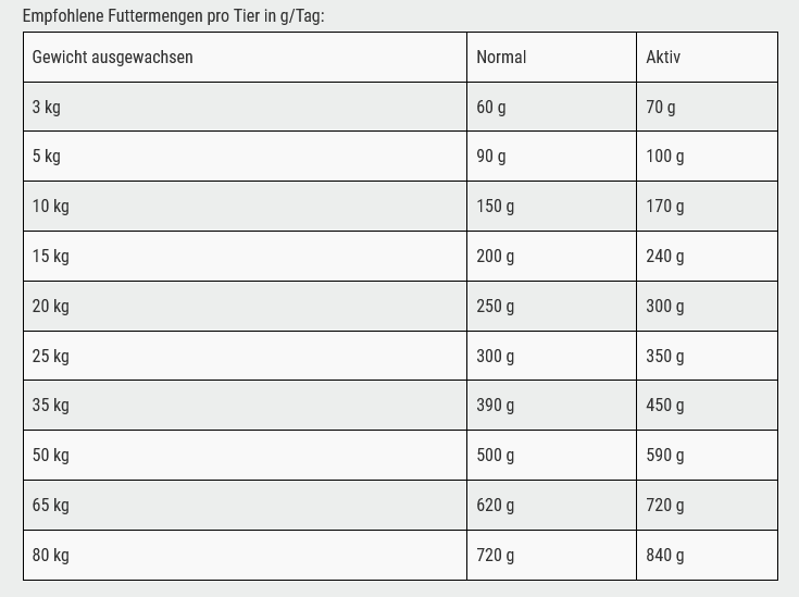 Der begrenzte Gehalt an Proteinen und Fett ist an den Bedarf von Hunden mit normaler Aktivität angepasst. Wird die geeignete Menge gefüttert, bleibt das Körpergewicht bei angemessener Sättigung konstant.