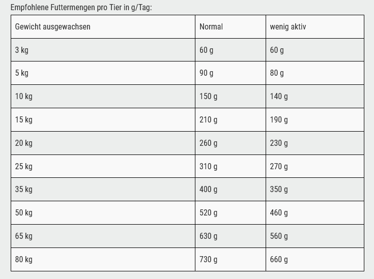 Anteil tierisches Eiweiß am Gesamteiweiß: 65 % (aus Pferd 60 %, aus Meeres-Zooplankton/Krill 5 %)