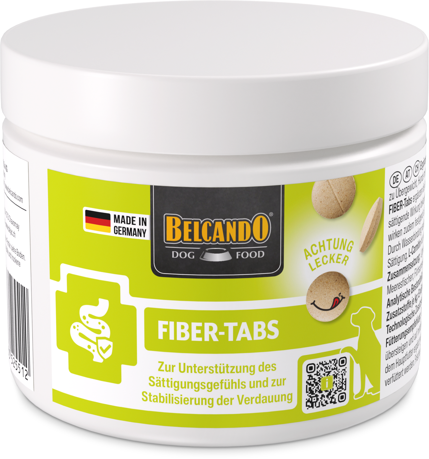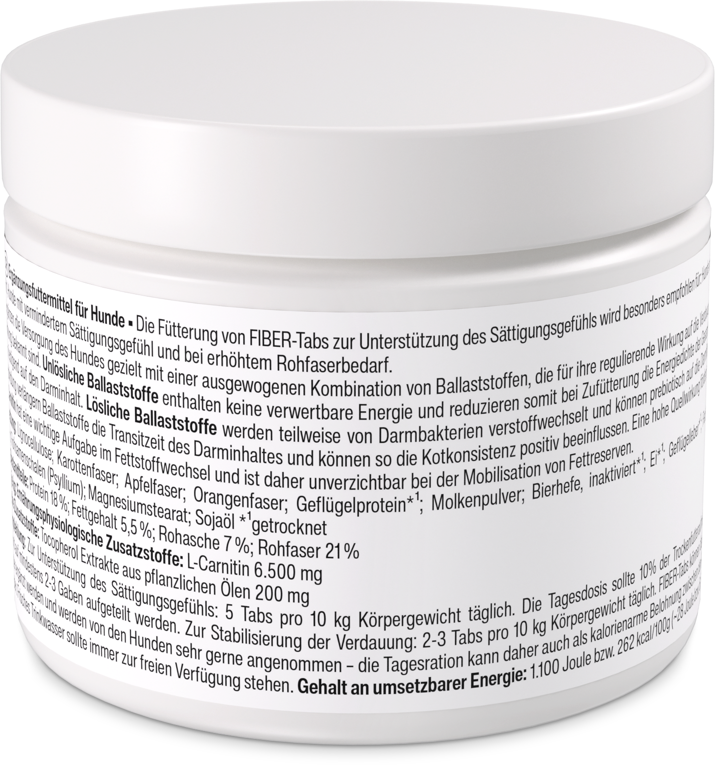 FIBER-Tabs ergänzen die Versorgung des Hundes gezielt mit einer ausgewogenen Kombination von Ballaststoffen, die für ihre regulierende Wirkung auf die Verdauung und ihre sättigende Wirkung bekannt sind.