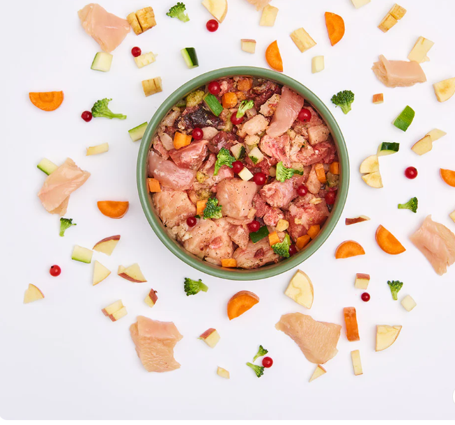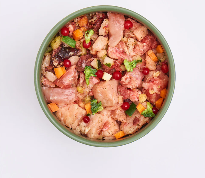 44 % Muskelfleisch, 16 % Hühnerhälse, 5,5 % Leber, 5,5 % Herz, 4 % Hühnerfett, 1,5 % Mägen, 5 % Pastinake, 4 % Möhre, 4 % Zucchini, 3 % Brokkoli, 3 % Apfel, 3 % Johannisbeere, 1,25 % Lachsöl, 0,25 % Seealgenmehl