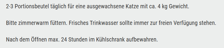 Protein 10,5 %; Fettgehalt 4,5 %; Rohasche 1,9 %; Rohfaser 0,5 %; Feuchtigkeit 80 %
